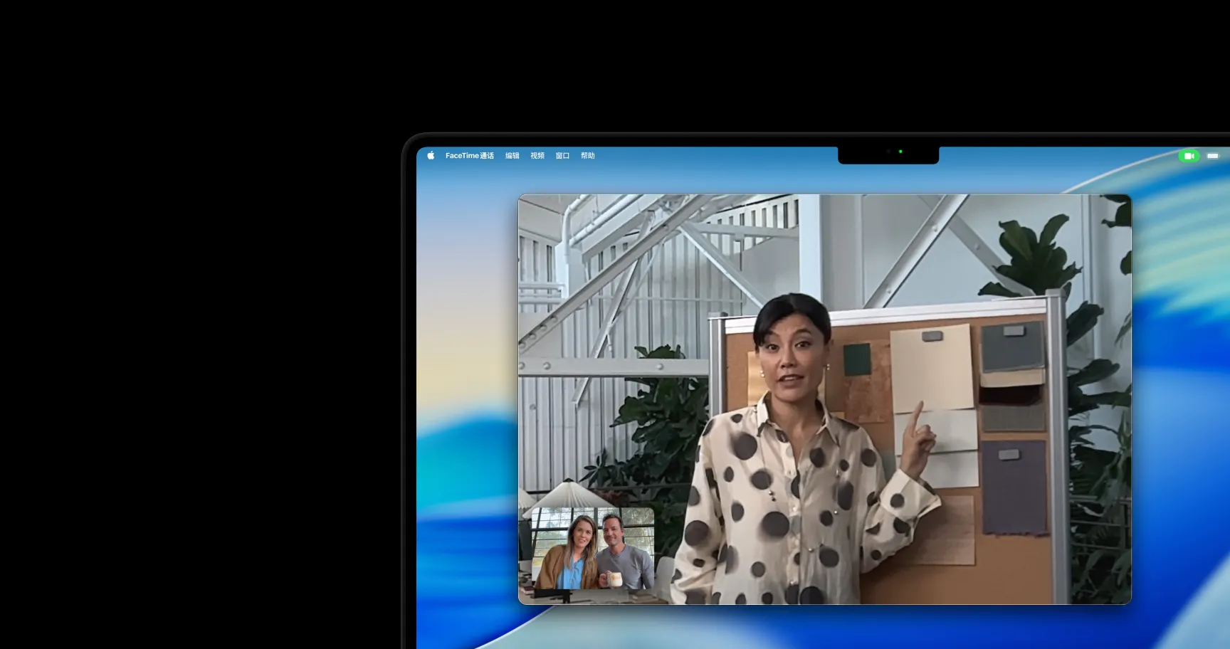摄像头。1200 万像素 Center Stage 摄像头会跟随你移动,让你始终都在镜头画面中。你还能借助桌上视角功能,将自己的工作台面展示给对方看。
